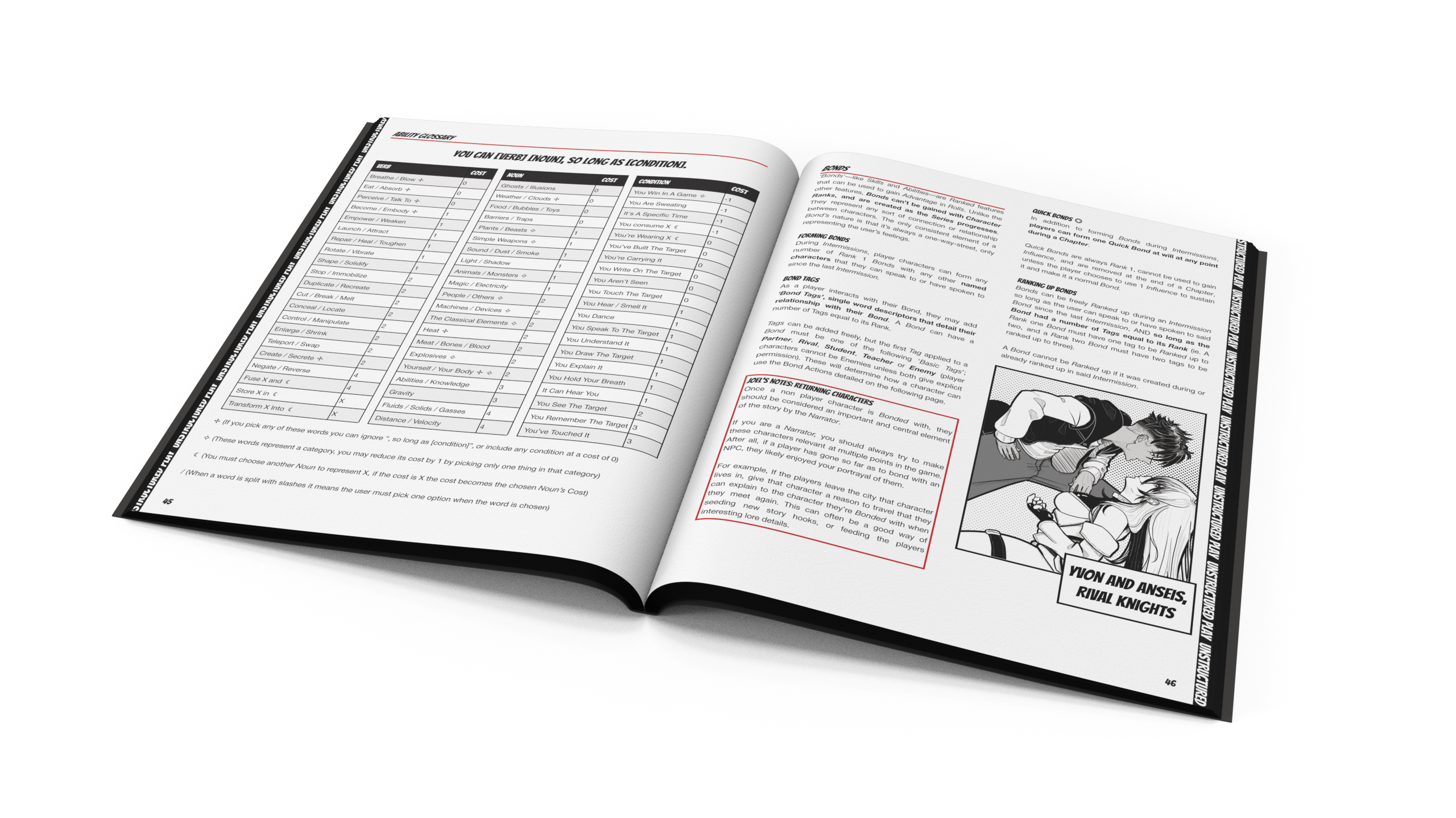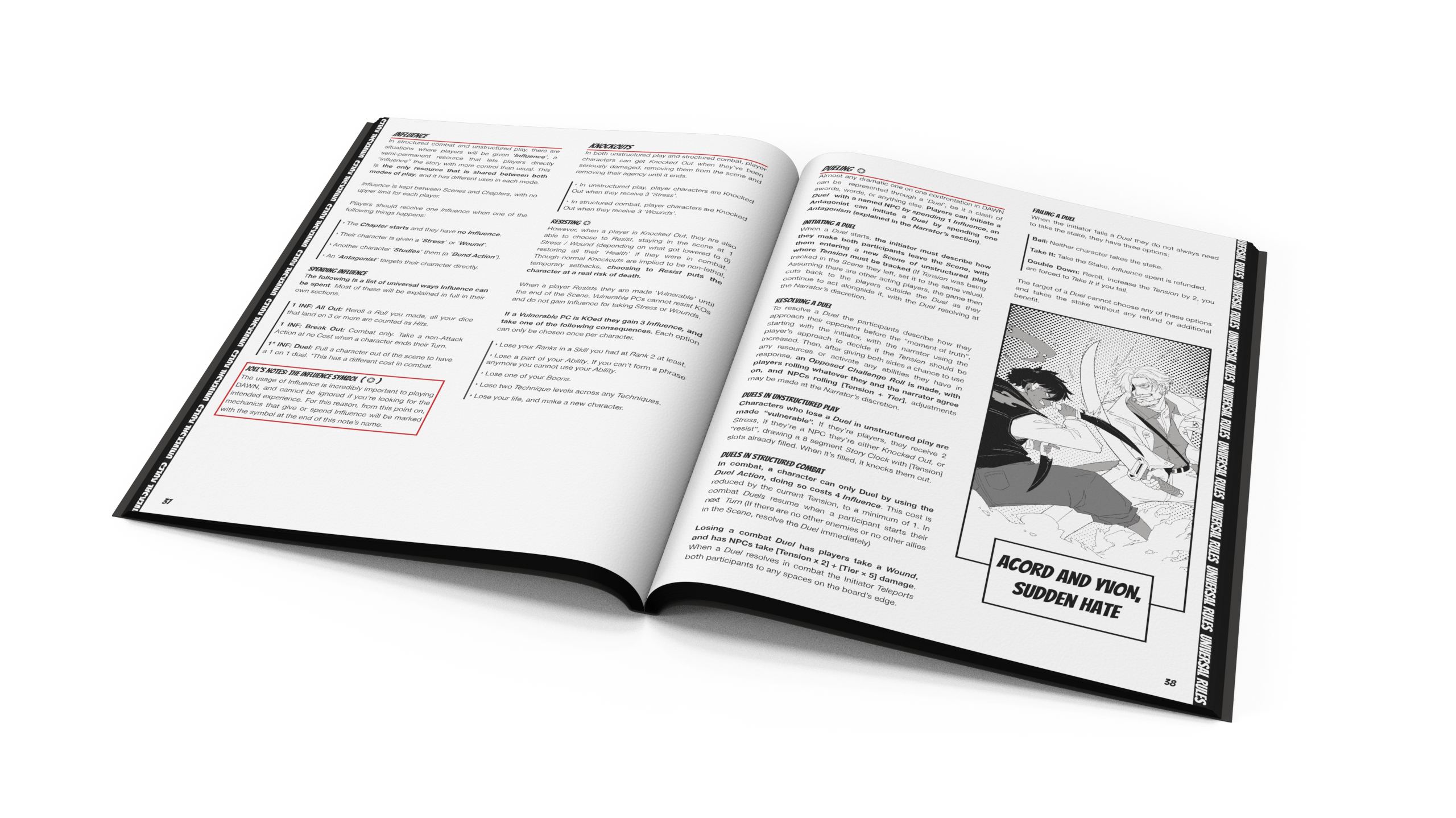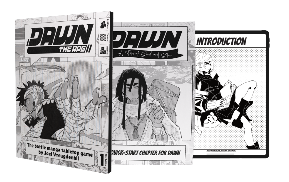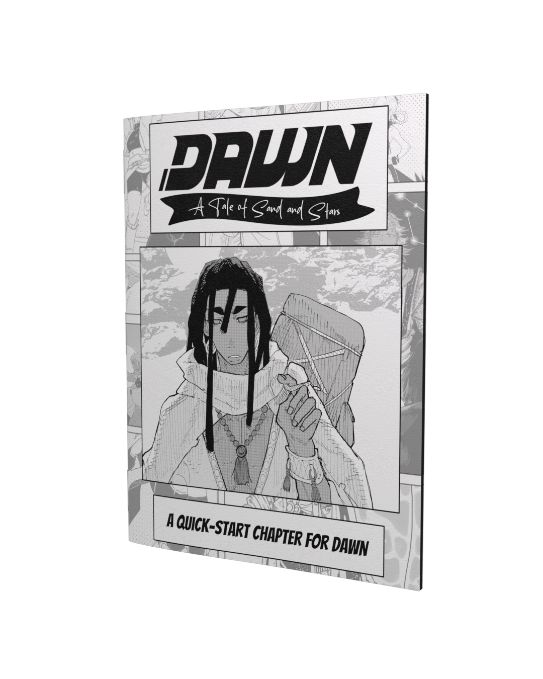 DAWN is a tactical TTRPG influenced by the "Battle Shonen" sub-genre of anime and manga. It's mechanically crunchy but dense, at a brisk ~130 pages. The game illustrates and explores three unique worlds in which players can tell their story, as well as provides instructions on how a group can create their own world in the style of the work that inspires DAWN. Every player controls a hero, with a fill-in-the-blanks ability that lets the player create a power unique to them, whether they can [Create] [Fire], or [Eat] [Energy. This is also reflected in combat, where all characters gain access to magic and physical attacks by default, allowing any character to utilize that custom ability regardless of their build.